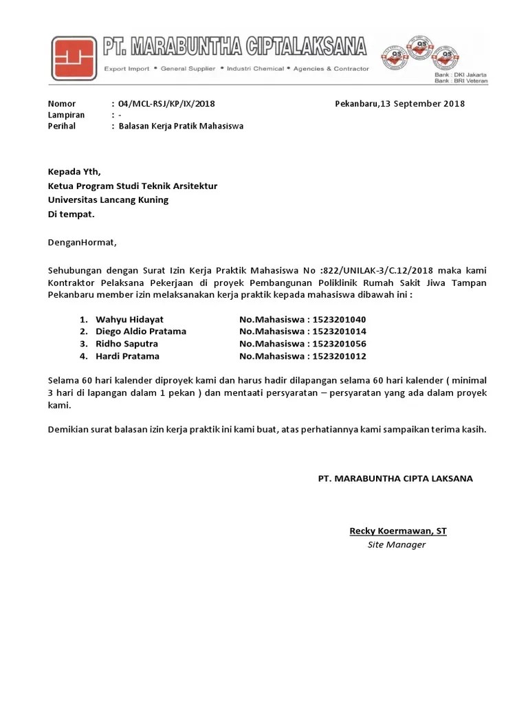 Dan ketika suatu pihak menerima surat dari pihak lain maka pada umumnya mereka akan. The collection that consisting of chosen picture and the best amongst others. surat balasan pkl sehubungan dengan hal tersebut kami mohon kiranya bapakibu dapat memberikan izin dan bantuannya kepada yang bersangkutan. Contoh surat balasan penerimaan pkl untuk berbagai jurusan. Contoh surat balasan praktek kerja lapangan atau magang pdf.